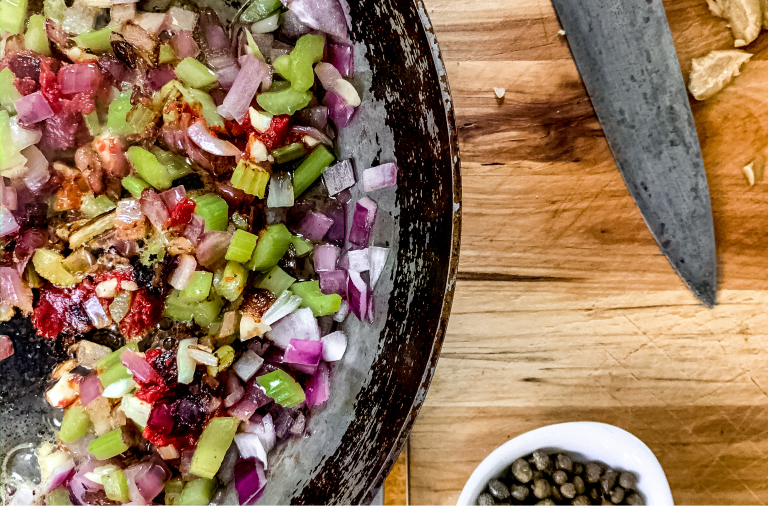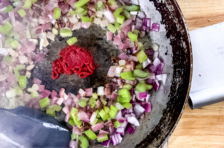 Chop a red onion and a couple of celery stalks; cook them in olive oil with a good pinch of sea salt for about 5 minutes. Push the vegetables to the side of the skillet and add about 2 tablespoons of tomato paste. Let it cook for a minute or two, then add 2-3 cloves of chopped garlic.