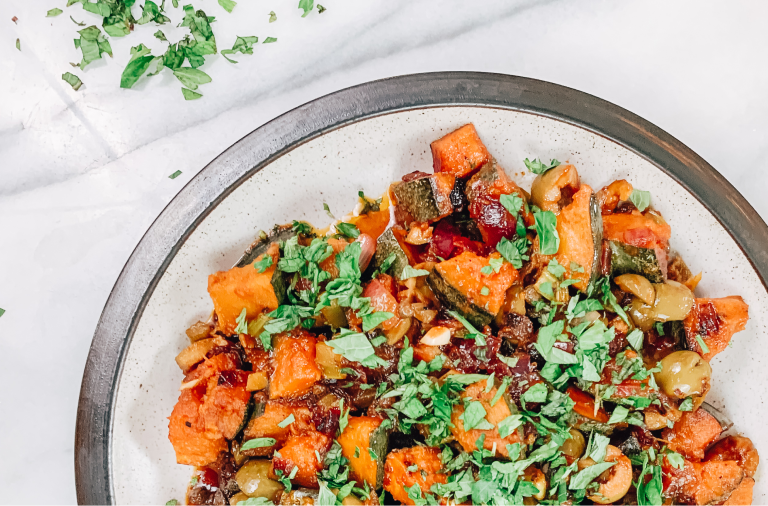 Add the cooked squash, the capers, and a handful of coarsely chopped green olives. Stir in a splash (2 tablespoons or so) of red wine vinegar and a couple tablespoons of Okinawan Brown Sugar.